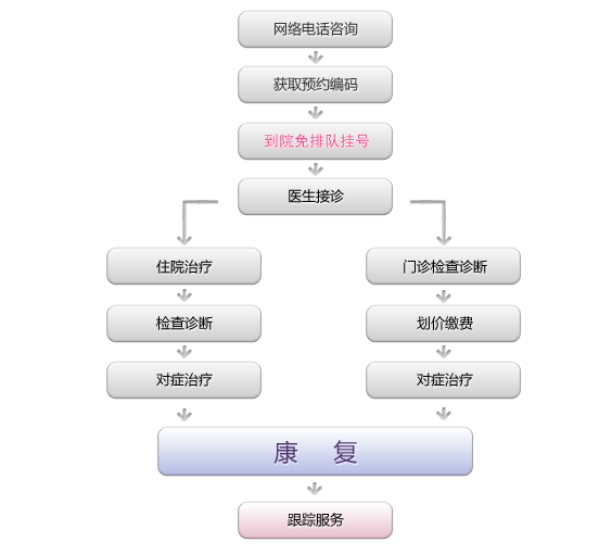 1、挂号:请您就诊前先在一楼导医台填写病历,并确定您所就诊的科室,导医护士将带您至收费处挂号。网络预约者请一定报出您预约时的名字,可以免挂号费。